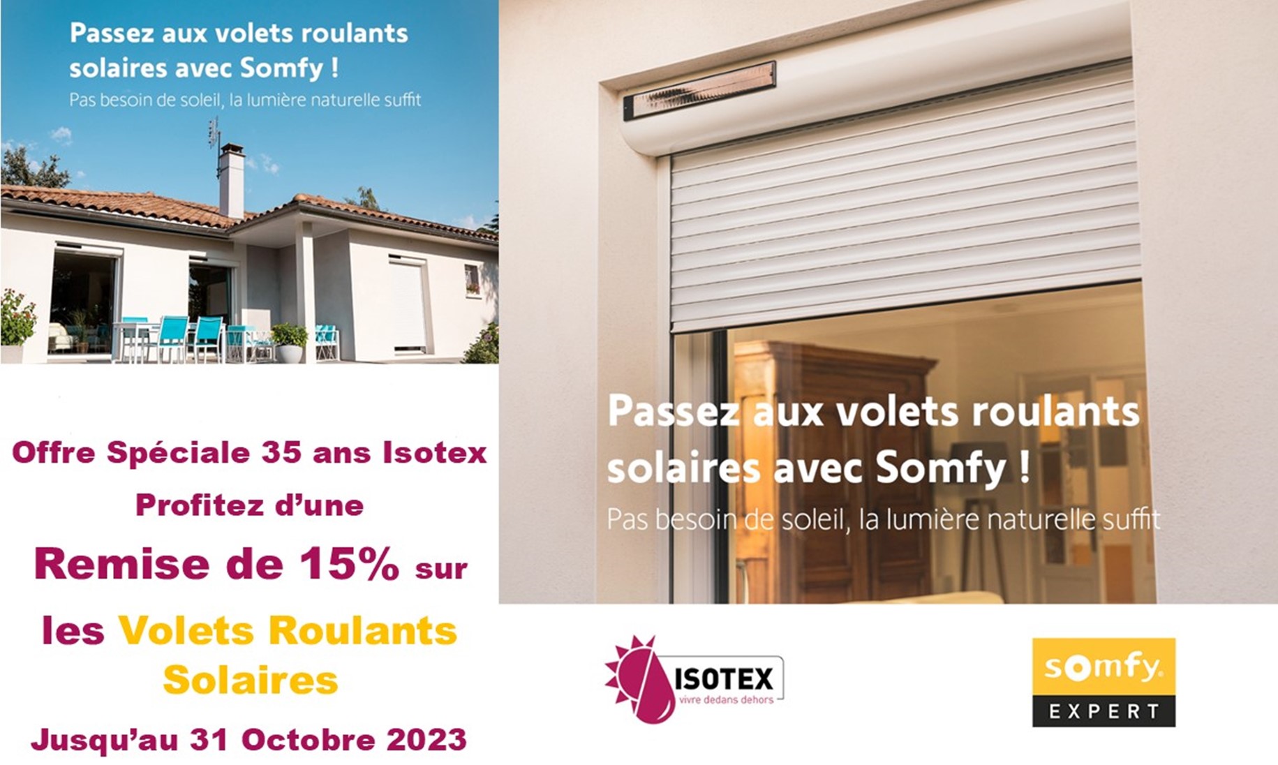 Isotex, votre fabricant de Volet Roulant à Bourgoin-Jallieu (38300) vous fait profiter d'une remise de 15% sur les Volets Roulants Solaires jusqu'au 31 Octobre 2023.