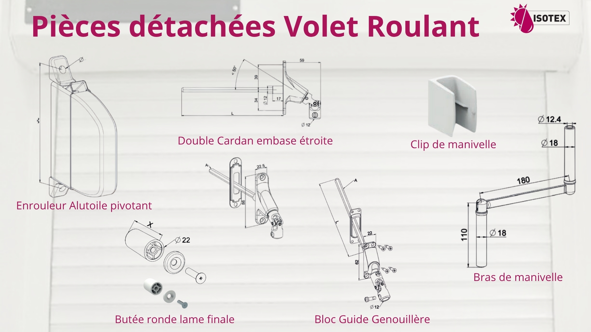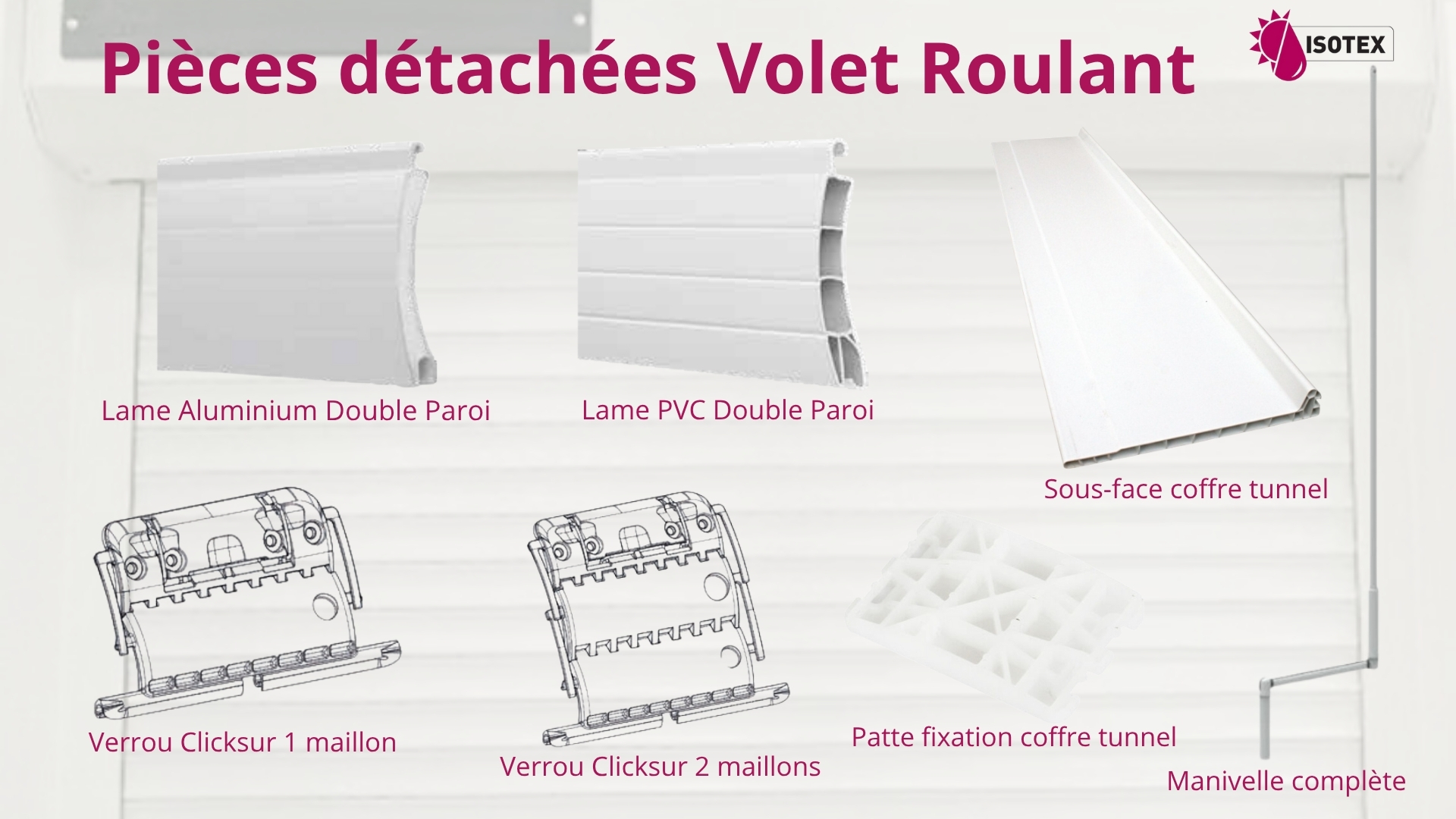 Pièces détachées de volets roulants en stock chez Isotex, votre fabricant en Isère depuis 1988. Réparez vos volets roulants motorisés ou manuels avec nos lames, manivelles, verrous...