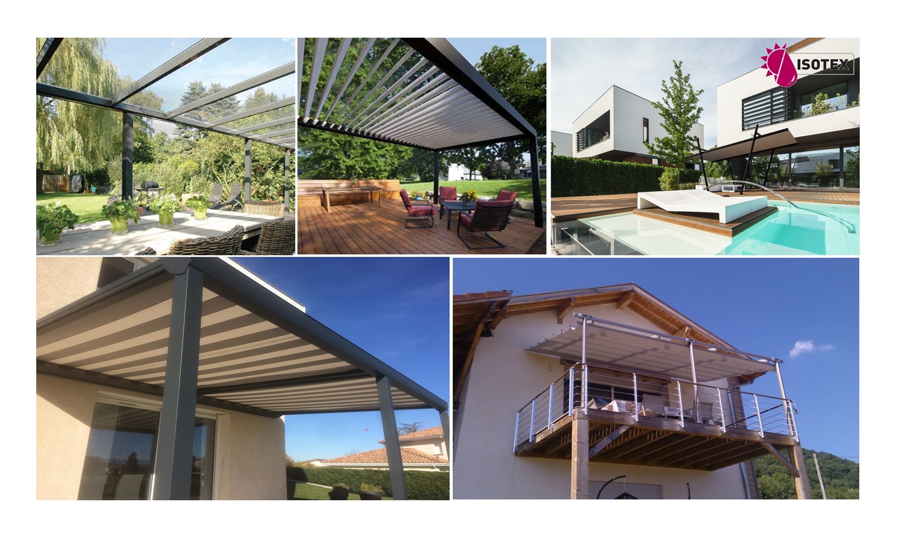 Fabrication sur mesure de votre pergola dans nos ateliers de Domarin à côté de 38300 Bourgoin-Jallieu: pergola bioclimatique Climatika, pergola toile Pergotoile, pergola toile Bambu, pergola toit fixe Atrium, pergola velum Zen...