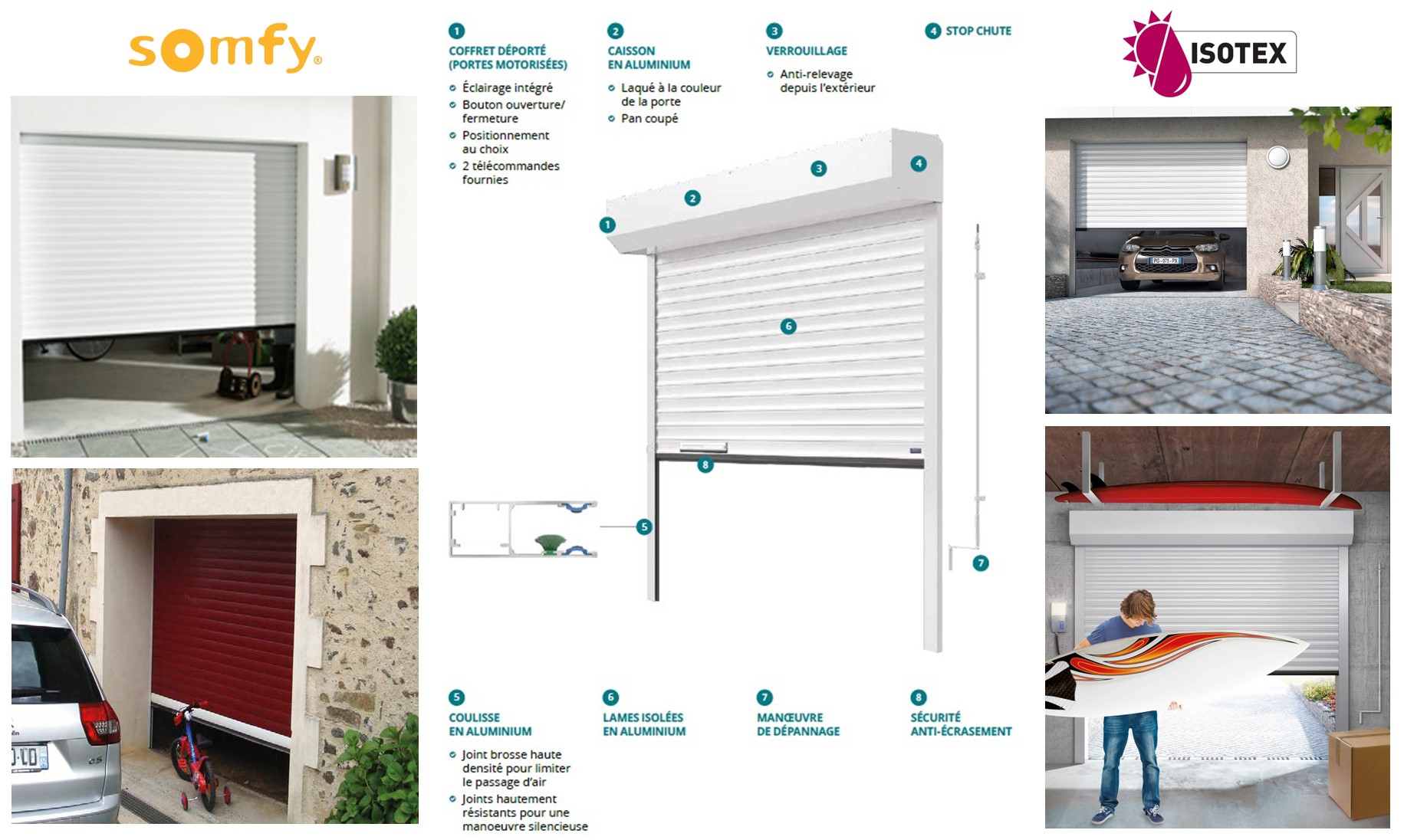 Le système comprend un récepteur, une barre palpeuse, un moteur et un antichute. Vous avez également le choix complet de la motorisation : Somfy RDO CSI 50 et Somfy RDO CSI 60.
