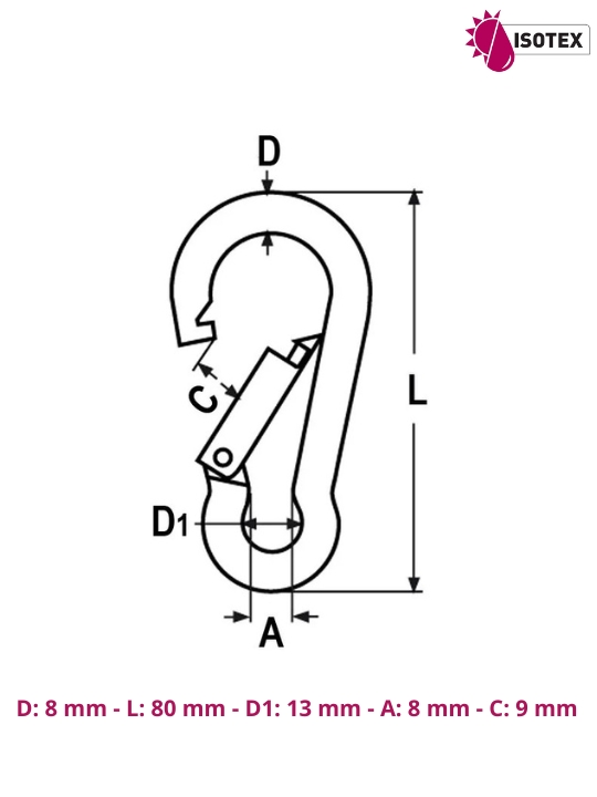 D: 8 mm - L: 80 mm - D1: 13 mm - A: 8 mm - C: 9 mm