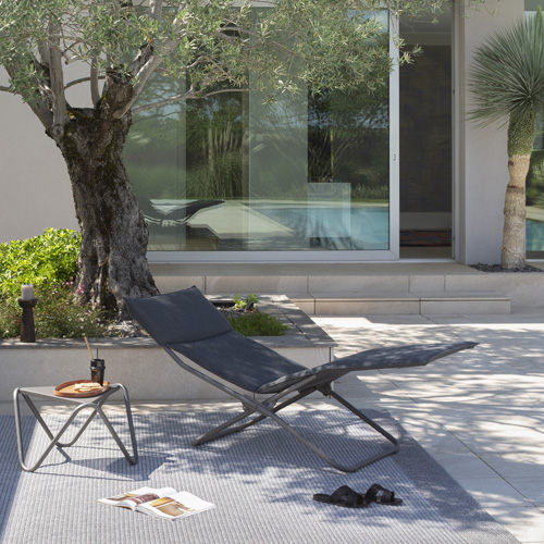 La toile Hedona, respirante, déperlante, et à séchage rapide, résiste aux éléments tout en étant facile à entretenir avec de l'eau savonneuse. La chaise longue est dotée d'un châssis grande dimension et d'un système d'articulation avec un verrouillage exclusif en position pliée, garantissant praticité et stabilité.