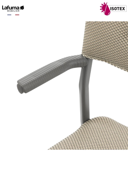 Accoudoirs aluminium ultra résistants avec enveloppe polymère moucheté et effet ondulé. Permettent au fauteuil d’être suspendu à la table pour faciliter le rangement ou l’entretien des sols.