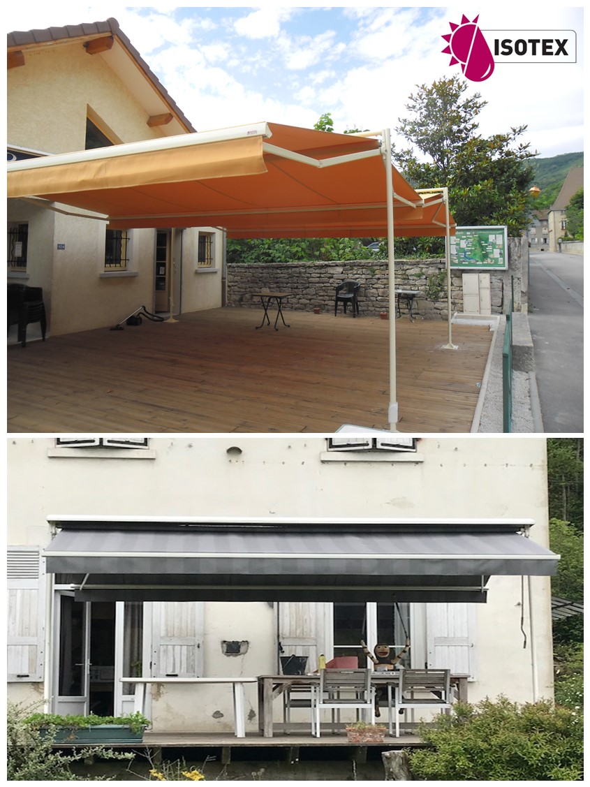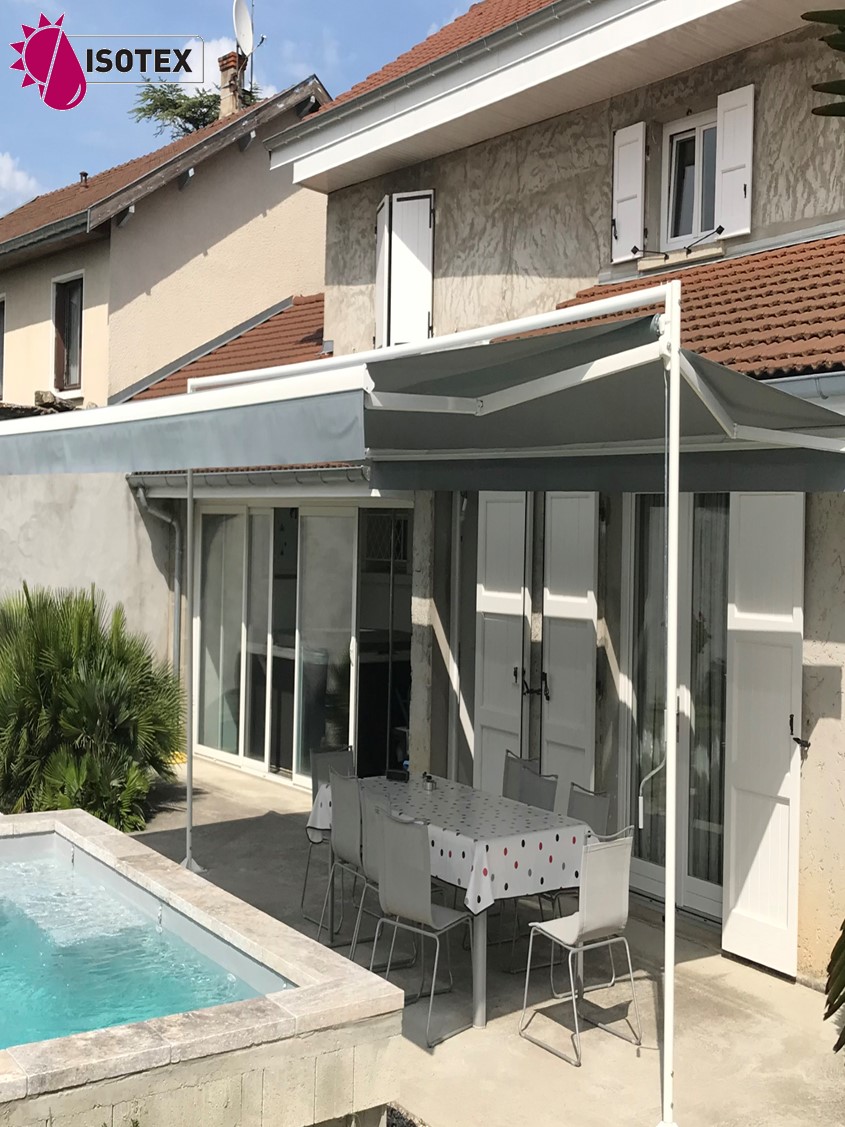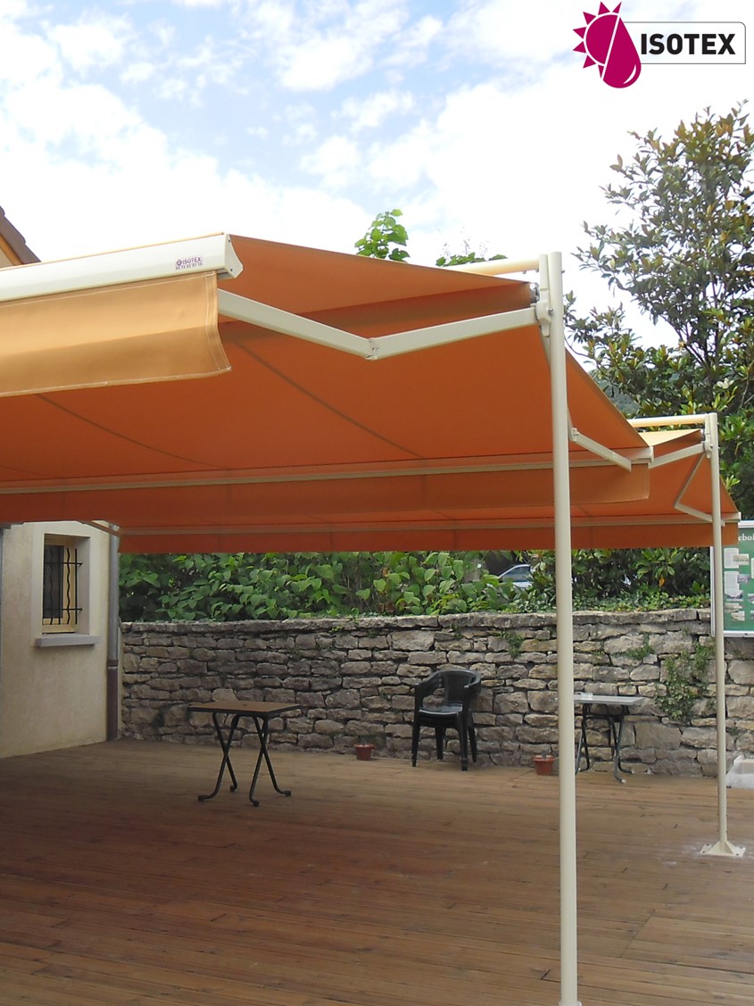 Store extérieur de terrasse sur pieds Isotex Ciella : Design, Confort et Sécurité. Jusqu'à 6,09 m de largeur et jusqu'à 4,00 m d'avancée ( 2x2 m). Fabriqué sur mesure dans nos ateliers. Garantie 5 ans.