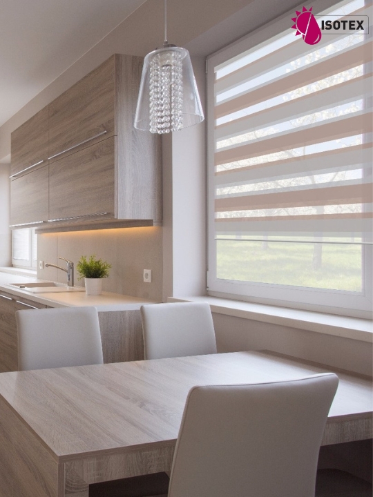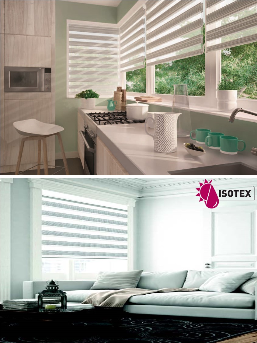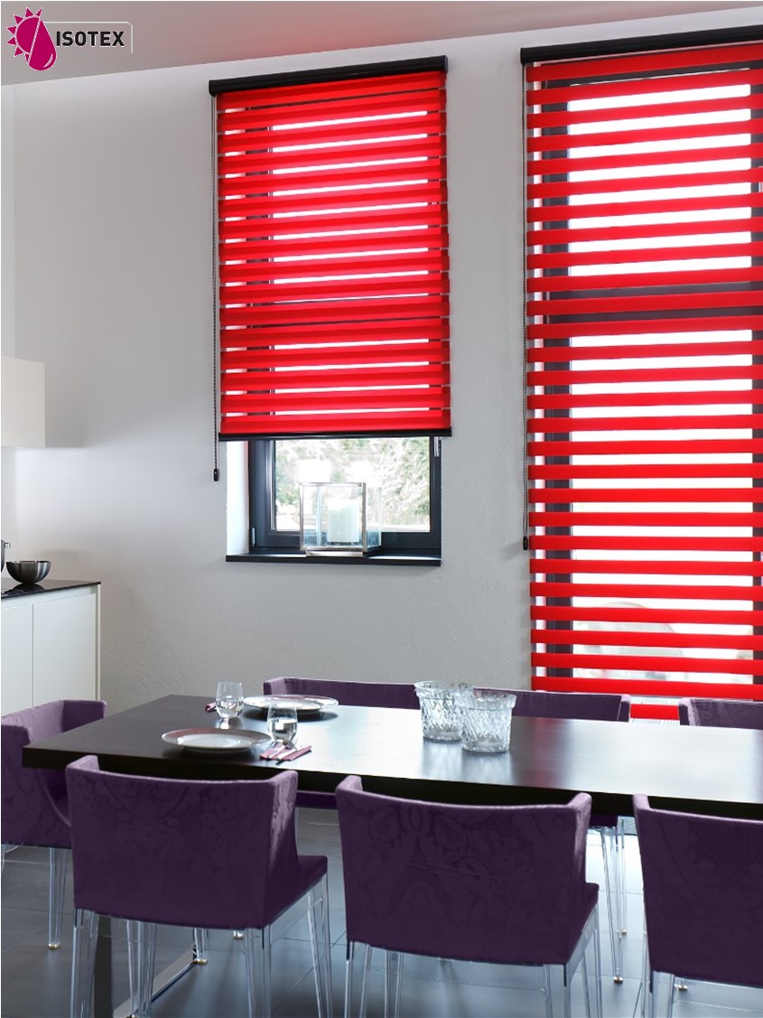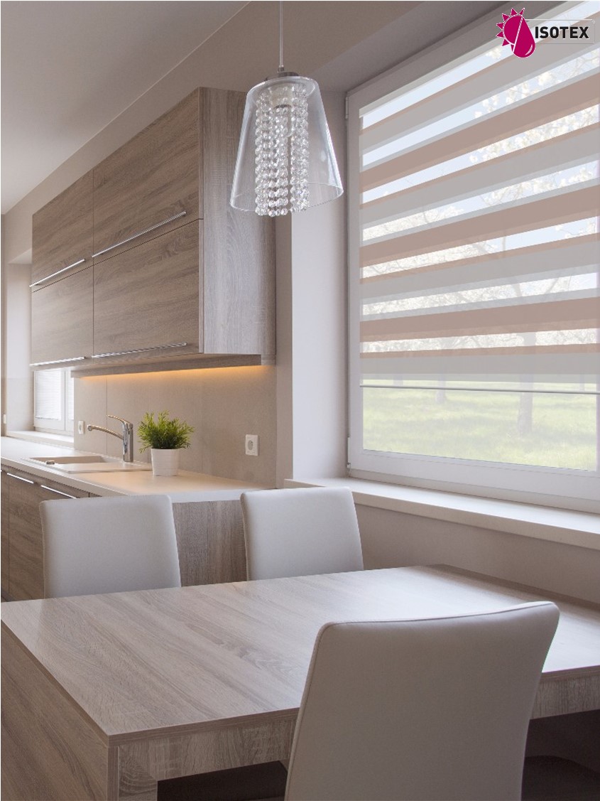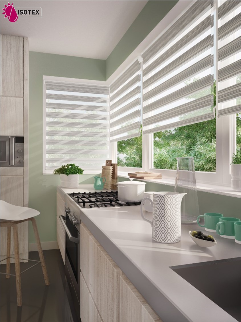 5. Bandes Horizontales de Tissus : Composé de deux bandes horizontales de tissus, l'une en voilage et l'autre opaque, qui défilent harmonieusement l'une devant l'autre. Ce mécanisme permet un dosage optimal de la lumière, offrant une ambiance personnalisée à tout moment de la journée.