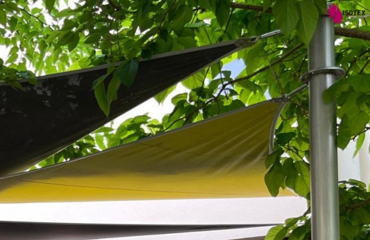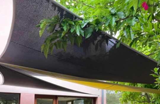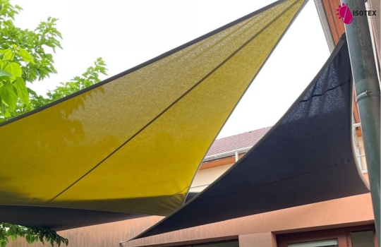Réalisation sur mesure de voiles d’ombrage Eliante STAR par Isotex près de Pont-de-Beauvoisin. Finitions inox et toile Soltis 92 coloris Bambou et Anthracite. Une protection élégante pour vos extérieurs en Nord Isère.