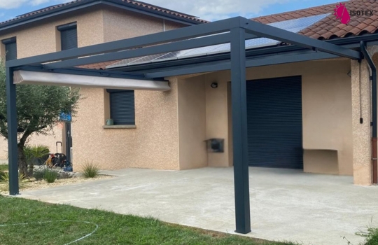 Découvrez notre réalisation sur mesure près de Morestel en Nord Isère : une pergola Clima 120 de 4150 mm de largeur et 4900 mm de projection. Toile Serge Ferrari Soltis 96 Lounge, coloris beige sablé, et armature gris anthracite. Parfaite pour votre extérieur en région Rhône-Alpes, alliant esthétique et fonctionnalité.