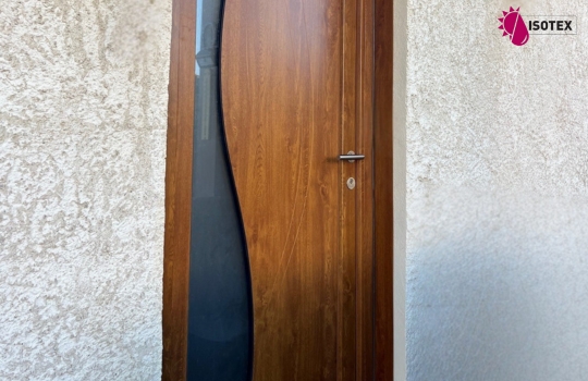 Réalisation sur mesure Isotex à La Tour-du-Pin (Nord Isère) : porte d’entrée PVC Normabaie au design chaleureux chêne doré. Sécurité renforcée, performance thermique.