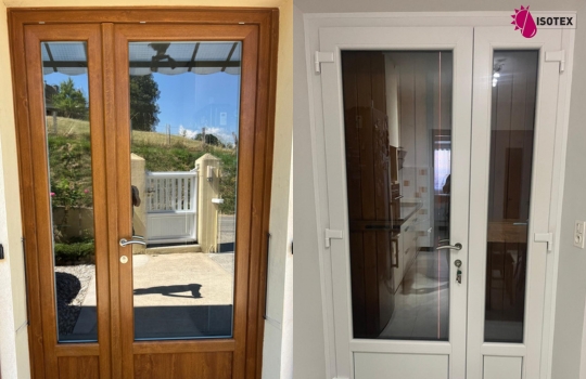 Isotex a réalisé sur mesure une porte d’entrée PVC 2 vantaux à L’Isle d’Abeau (38080) en Nord Isère. Pose en rénovation avec finition bois chêne doré et double vitrage performant pour plus de sécurité et d’isolation.