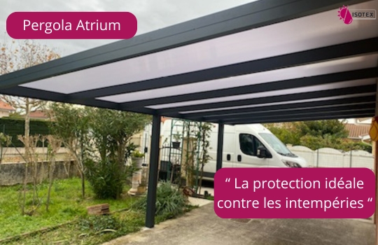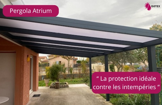 Transformez votre extérieur à Morestel avec la réalisation sur mesure d'une pergola Atrium par Isotex. Sa toiture en polycarbonate et sa structure robuste en aluminium, fabriquées en Isère, vous garantissent un confort optimal et une esthétique moderne toute l'année.