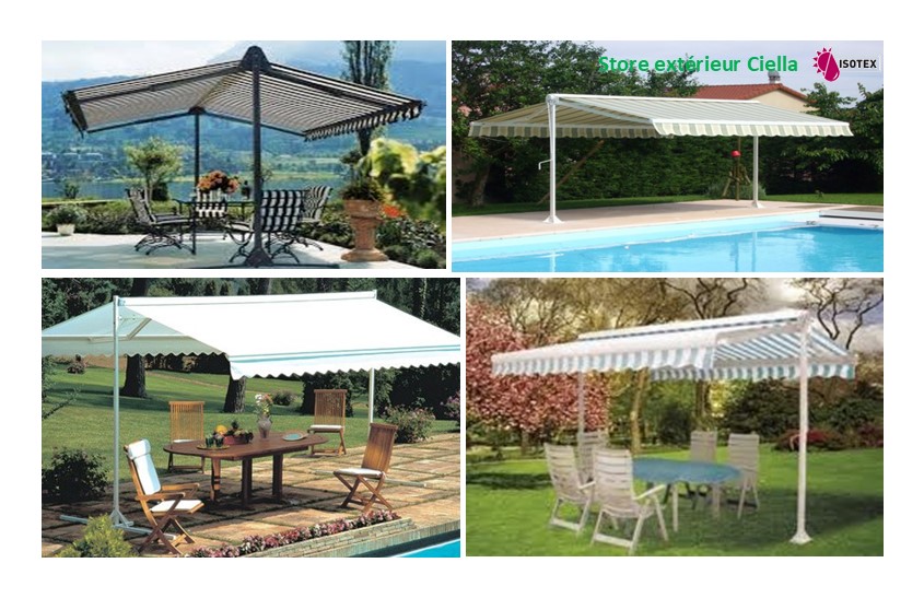 Store extérieur de terrasse sur pieds Isotex Ciella : Design, Confort et Sécurité. Jusqu'à 6,09 m de largeur et jusqu'à 4,00 m d'avancée ( 2x2 m).