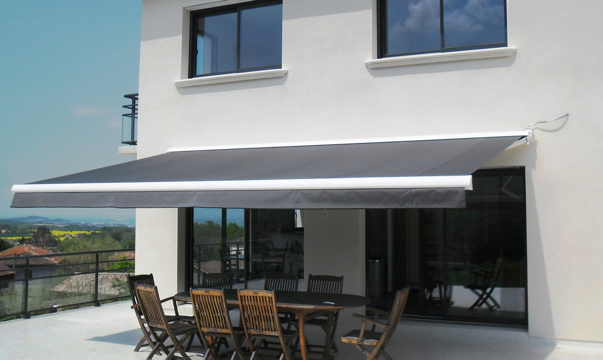 Store Luxia, 5.94 m x 3.50 m d'avancée, motorisation Somfy avec capteur vent Eolis 3D,