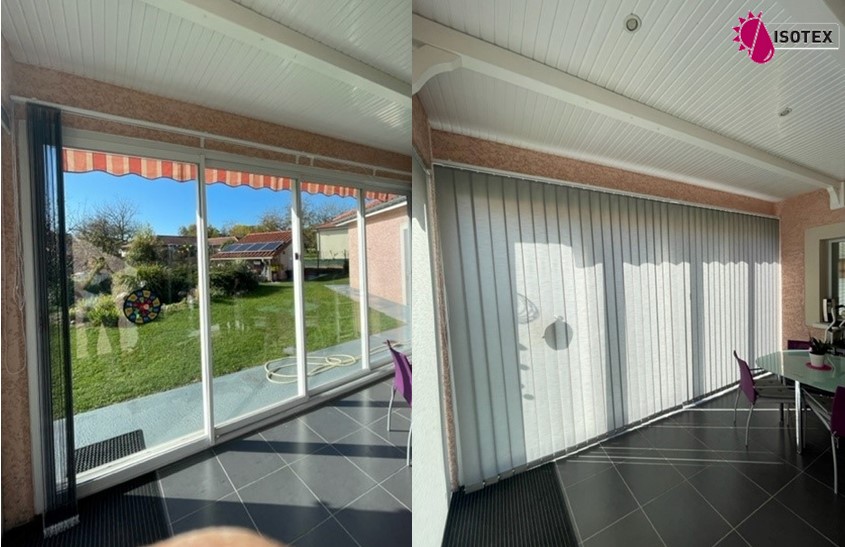 Réalisation sur mesure par Isotex aux alentours de Pont-de-Beauvoisin (Nord Isère) : store intérieur à bandes verticales, idéal pour baies vitrées et intérieurs contemporains. Fabrication locale pour un confort discret et efficace.